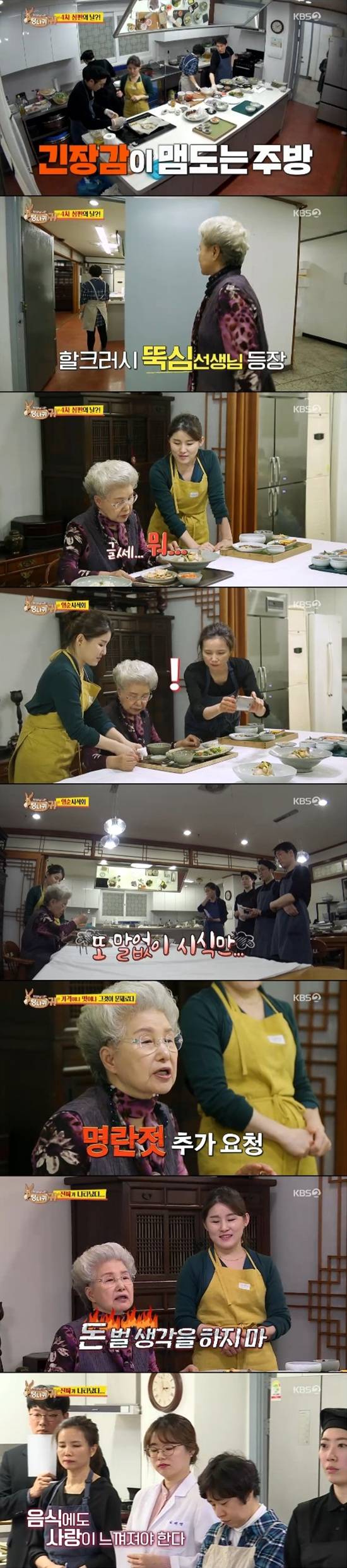 심영순은 또각또각 구두 소리를 내며 평가 자리에 나타났다. 장윤정은 바로 직원들을 집합시켰다. 장윤정은 평가에 앞서 심영순이 음식이 마음에 들면 음식을 입에 넣자마자 바로 고개를 끄덕인다고 알려줬다.