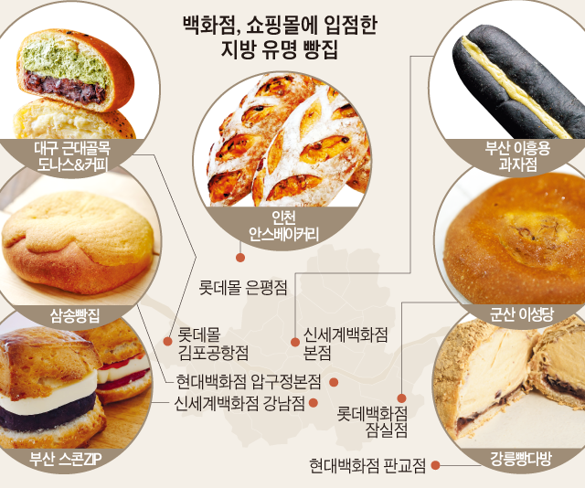 신세계백화점은 부산 '이흥용과자점'을 2014년 유치해 현재 5개 점포에서 매장을 운영하고 있다. 친숙하면서도 새로운 해운대오징어먹물빵, 자갈치명란바게트가 인기다. 신세계 강남점에서 하루 1000만원어치가 팔리는 부산 '스콘ZIP' 빵은 소셜미디어에서 '강남 디저트'라는 별명으로 통한다. 현대백화점은 지난해 판교점에서 시험 판매한 '강릉빵다방'의 인절미빵이 일주일 만에 1억원 매출을 올리자, 바로 입점 결정을 내렸다.