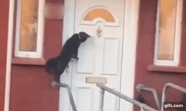 공유된 영상을 보면 검은 고양이 한 마리는 현관문 바로 앞까지 이어진 계단 난간 위에 올라서서 현관문의 노크용 문고리로 문을 네 차례 두드린다. 그러고나서 고양이는 난간 위에서 그대로 문이 열리기를 기다린다.