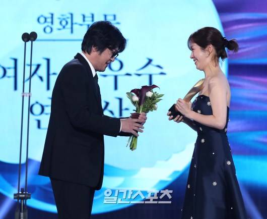 한지민이 1일 오후 서울 강남구 삼성동 코엑스에서 열린 ’제55회 백상예술대상' 시상식에서 '미쓰백'으로 영화부문 여자최우수 연기상을 김윤석으로 부터 받고 있다.