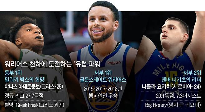 하지만 유럽 농구 천재들을 앞세운 강력한 대항마들이 등장해 그 어느 때보다 우승이 쉽지 않을 것이란 예측이 나온다. 야니스 아데토쿤보(25·그리스)가 이끄는 밀워키 벅스, 세르비아 출신의 장신 센터 니콜라 요키치(24·213㎝)가 버틴 덴버 너기츠다.