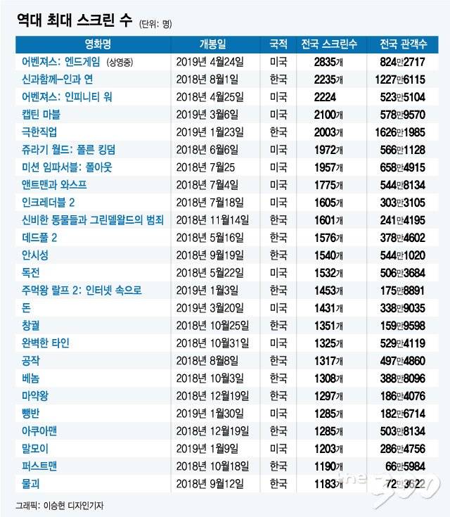 마블 시네마틱 유니버스(MCU) 시리즈는 한국에서 항상 '승자'였다. 앞서 개봉한 MCU 21편의 누적 총 관객수는 1억명을 넘겼다. 22번째 영화이자 피날레인 '엔드게임'은 기대만큼이나 개봉 첫날부터 2835개의 스크린을 확보, 역대 최다 스크린 수를 경신했다.