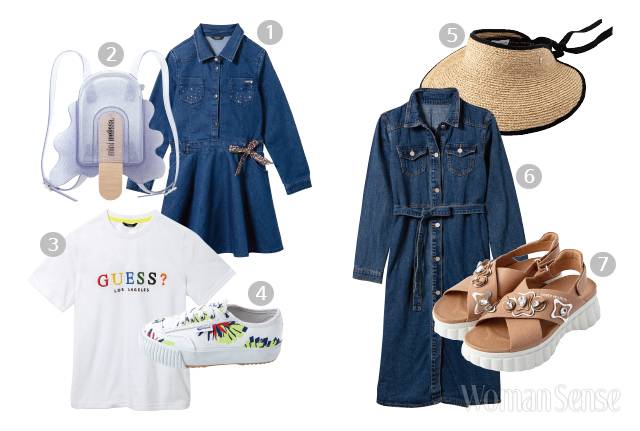 (좌) KID 1 보 디테일 데님 셔츠 원피스 13만9천원 게스키즈. 2 PVC 소재 아이스 바 백팩 10만원대 미니멜리사. 3 컬러 로고 레터링 티셔츠 4만9천원 게스키즈. 4 플라워 패턴 스니커즈 6만9천원 페이유에. (우) MOM 5 와이드 브림 라피아 선바이저 23만원 헬렌카민스키. 6 다크 블루 벨티드 데님 원피스 3만9천원대 러브패리스. 7 베이지 주얼 장식 플랫폼 샌들 35만8천원 토리버치.