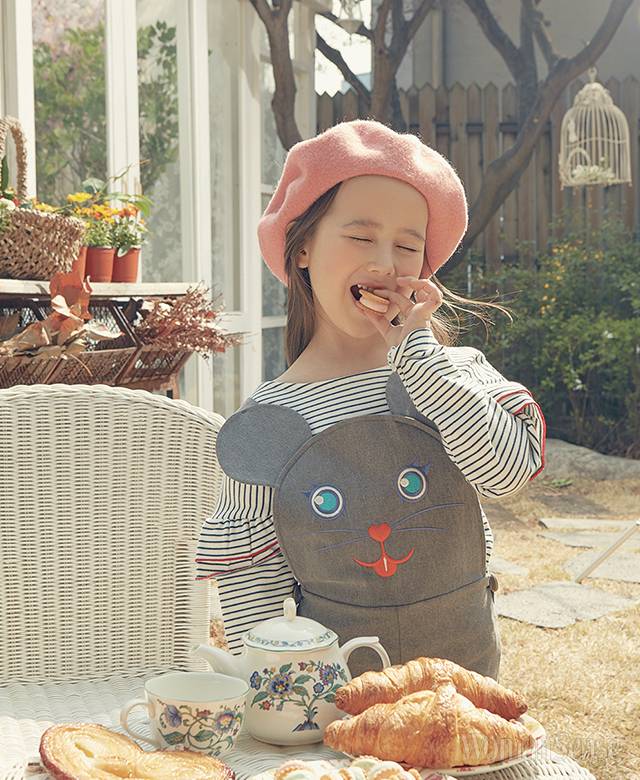 소매 프릴 포인트 스트라이프 톱 12만5천원 쁘띠바또, 마우스 캐릭터 오버올 팬츠 8만9천원 에어피쉬, 핑크 베레 스타일리스트 소장품.