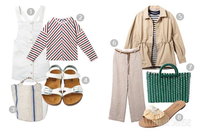 (좌) KID 1 화이트 데님 오버올 스커트 6만2천원 마시모두띠 키즈. 2 멀티 컬러 스트라이프 톱 12만3천원 쁘띠바또. 3 리넨 스트라이프 토트백 1만8천원대 우트 by 스콘. 4 버클 디테일 화이트 샌들 6만9천원 스텝케어 by 플락톤. (우) MOM 5 베이지 재킷 10만3천원 아워코모스, 스트라이프 톱 11만8천원 세인트제임스. 6 베이지 리넨 벨티드 와이드 팬츠 15만9천원 엣코너. 7 산뜻한 컬러 조합의 우븐 토트백 6만9천원 자라. 8 플라워 모티브 장식 라피아 슬라이드 28만8천원 슈츠.