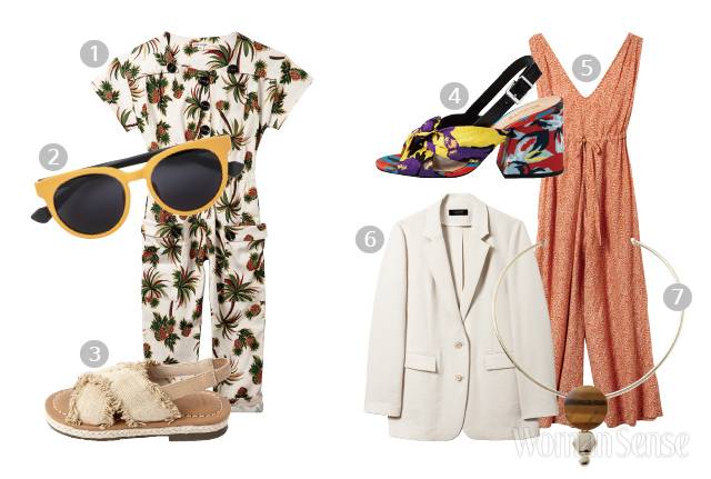 (좌) KID 1 트로피컬 패턴의 점프 슈트 11만8천원 우트 by 피쉬앤키즈. 2 옐로 프레임 선글라스 6만5천원 SNRD. 3 베이지 패브릭 스트랩 샌들 4만2천원 빔보빔바. (우) MOM 4 아티스틱한 패턴의 오픈 토 슬링백 31만8천원 슈츠. 5 보태니털 패턴의 V넥 점프 슈트 가격미정 바네사브루노. 6 미니멀한 실루엣의 테일러드 재킷 49만9천원 질스튜어트 뉴욕. 7 볼드한 펜던트가 돋보이는 골드 네크리스 3만9천원 앤아더스토리즈.