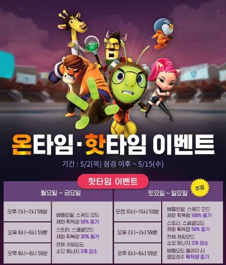 온라인게임 '카운터스트라이크 온라인'에서는 5월5일 어린이날을 맞아 접속하는 모든 이용자에게 '카트라이더' 인기 캐릭터 배찌와 다오의 가면 아이템을 선물한다. 또한, 모든 맵 경험치를 3배 이상으로 적용하는 이벤트와 함께 '듀얼소드 팬텀 슬레이어', '매그넘 런처', 'M3 블랙 드래곤' 등 프리미엄 무기를 무료로 체험할 수 있는 기회를 제공한다.