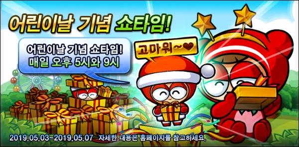 '마비노기 영웅전'에서는 5월16일까지 게임 내 일일미션을 달성하거나 30레벨 이상 일반전투 완수 시 '[2019 어린이날 기념 쿠폰]'을 지급한다. 쿠폰을 모으면 전용 상점을 통해 '봄꽃 어린이 세트', '질풍의 레이서 세트', '리엘의 장난감 무기 선택 상자' 등 다양한 게임 아이템으로 교환할 수 있다.