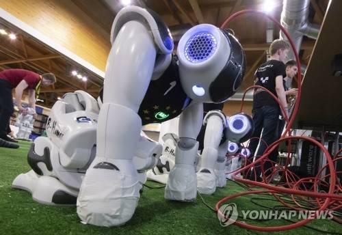 Robots hang on a battery charging station prior a soccer match of the Standard Platform Liga competition at the RoboCup GermanOpen 2019 in Magdeburg, Germany, Friday, May 3, 2019. Teams from 16 countries demonstrate the state-of-the-art in robotics with competitions such as in soccer, rescue and service robots until Sunday, May 5, 2019. (AP Photo/Jens Meyer)