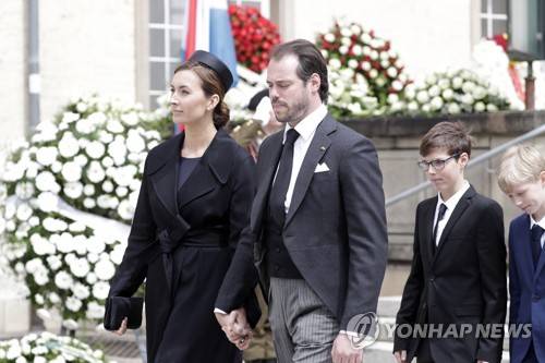 epa07546645 Prince Felix (R) and Princess Claire of Luxembourg (L) leave the Notre-Dame Cathedral after the funeral of Grand Duc Jean of Luxembourg, in Luxembourg, 03 May 2019. Grand Duc Jean died at the age of 98 on 23 April 2019. EPA/JULIEN WARNAND