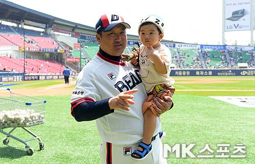 조인성 코치가 아들을 안고 미소짓고 있다. jh1000@maekyung.com