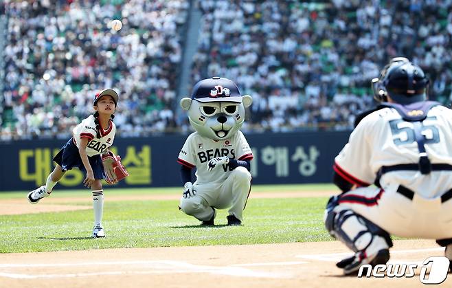 (서울=뉴스1) 오대일 기자 = 어린이날인 5일 오후 서울 송파구 잠실야구장에서 열린 프로야구 '2019 신한은행 MY CAR KBO 리그' LG 트윈스와 두산 베어스의 경기에 앞서 아역배우 오아린 양이 시구를 하고 있다. 2019.5.5/뉴스1