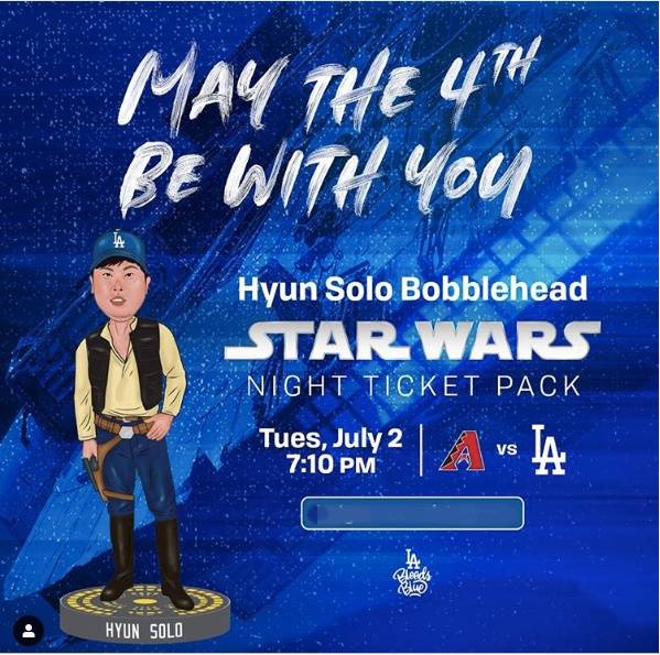 다저스 구단은 이날 구단 SNS을 통해 '한 솔로'로 변신한 류현진의 버블헤드 인형 '현 솔로'를 소개하면서 '스타워즈 데이' 이벤트를 알렸다.