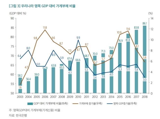1534조원에 달한 우리나라 가계부채는 그 증가율이 2010년을 제외하고 매년 명목 GDP 증가율 보다 높은 수준을 유지하면서 GDP대비 비율이 2004년 56.4%에서 지난해 86.1%에 달했다. 가계부채 통계가 있는 2002년부터 2017년까지 15년간 연평균 성장률을 비교해 보면 명목 GDP는 연평균 5.6% 증가한 반면, 가계부채는 연평균 7.9% 증가해 부채 증가율이 2%포인트 이상 높았다.