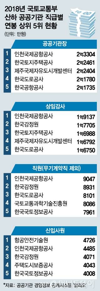 16개 기관장이 연봉이 올랐고 6곳은 떨어졌다. 인천국제공항공사 사장(2억3304만원·전년대비 28.5%↑)과 한국토지주택공사 사장(2억2461만원·15.9%↑)이 각각 연봉 1, 2위에 올랐다.