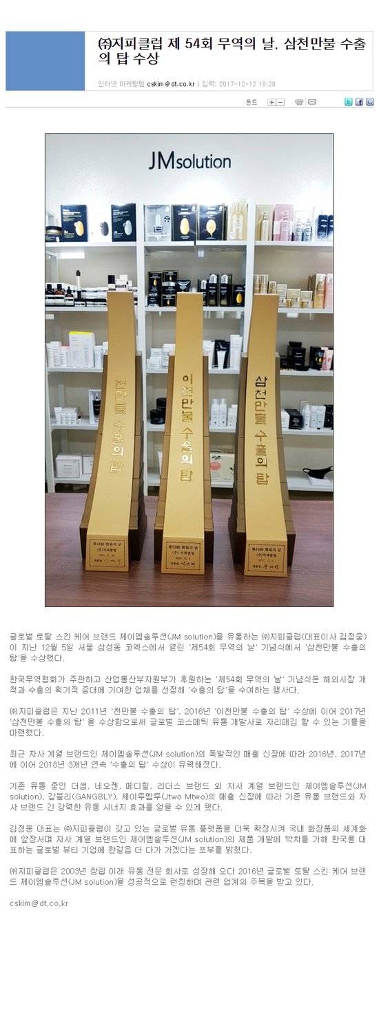 지피클럽이 운영하는 JM솔루션은 K뷰티 붐의 수혜를 입은 대표적인 브랜드로 꼽힌다. 김정웅 지피클럽 대표는 2016년 중국인들이 즐겨 찾는 국내 마스크 팩과 에센스에 대한 니즈를 파악하고 JM솔루션을 만들었다. 이병헌·한효주·김고은·정은채 등 당대 최고의 배우를 앞세운 다모델 전략까지 맞아 떨어지면서 대륙에서 인기가 치솟았다.