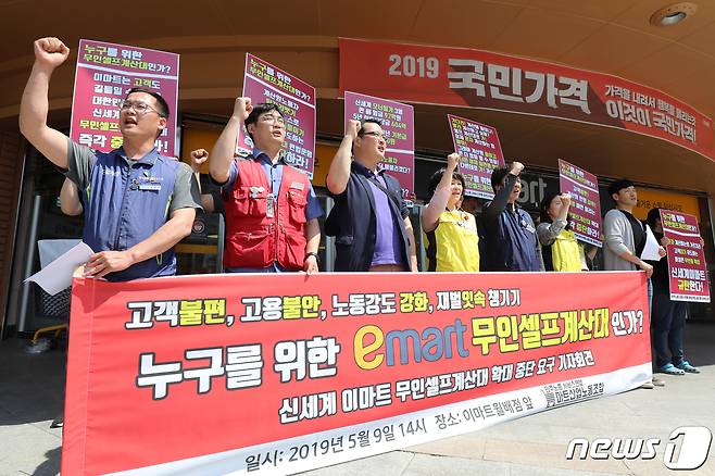(대구=뉴스1) 공정식 기자 = 민주노총 서비스연맹 마트산업노동조합 이마트지부 노조원들이 9일 오후 대구 달서구 이마트 월배점 앞에서 열린 기자회견에서 신세계 이마트 점포에서 운영 중인 무인셀프계산대 확대 중단을 촉구하는 구호를 외치고 있다. 2019.5.9/뉴스1