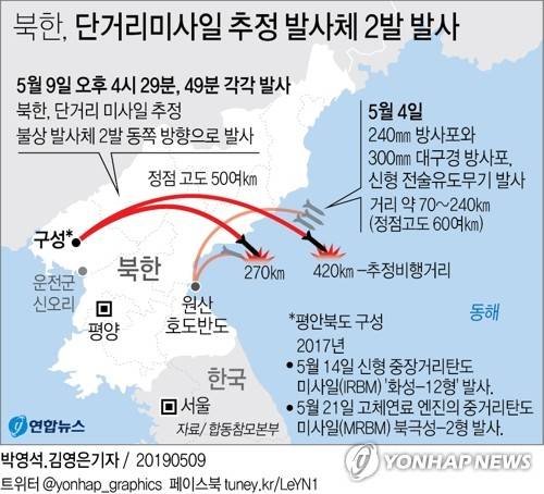![합참 "北, 단거리미사일 추정발사체 2발 동해방향 발사" (서울=연합뉴스) 북한이 9일 오후 단거리 미사일로 추정되는 불상 발사체 2발을 동해 방향으로 발사했다. 지난 4일 240㎜ 방사포와 300㎜ 대구경 방사포, 신형 전술유도무기를 발사한 지 5일 만이다. 합동참모본부는 "9일 오후 4시 29분과 4시 49분경 평안북도 구성 지역에서 단거리 미사일로 추정되는 불상 발사체 각각 1발씩 2발을 동쪽 방향으로 발사했다"고 밝혔다. 사진은 지난 4일 동해상에서 진행된 대구경 장거리 방사포와 전술유도무기 화력타격훈련. 이 사진은 지난 5일 조선중앙통신이 공개했다. [국내에서만 사용가능. 재배포 금지. For Use Only in the Republic of Korea. No Redistribution] [연합뉴스 자료사진] photo@yna.co.kr](https://img2.daumcdn.net/thumb/R658x0.q70/?fname=https://t1.daumcdn.net/news/201905/09/yonhap/20190509201714861mkvh.jpg)