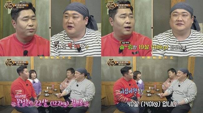 이날 김준현은 본격적인 먹방에 앞서 문세윤에게 현재 몸무게를 묻는다. 문세윤은 잠시 머뭇 거리더니 "19세(119kg) 정도 된다"고 나이에 비유한다. 김준현도 "나는 22세(122kg)다"라며 자신의 몸무게를 고백한다.