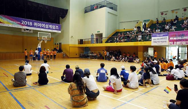 | ▲ 지난 2018년 6월 서울 은평구민체육센터에서 열린 '2018 퀴어여성게임즈' 개막식 장면. 애초 2017년 10월 동대문구체육관에서 열릴 예정이었지만, 갑작스런 대관 취소 통보로 연기됐다. |