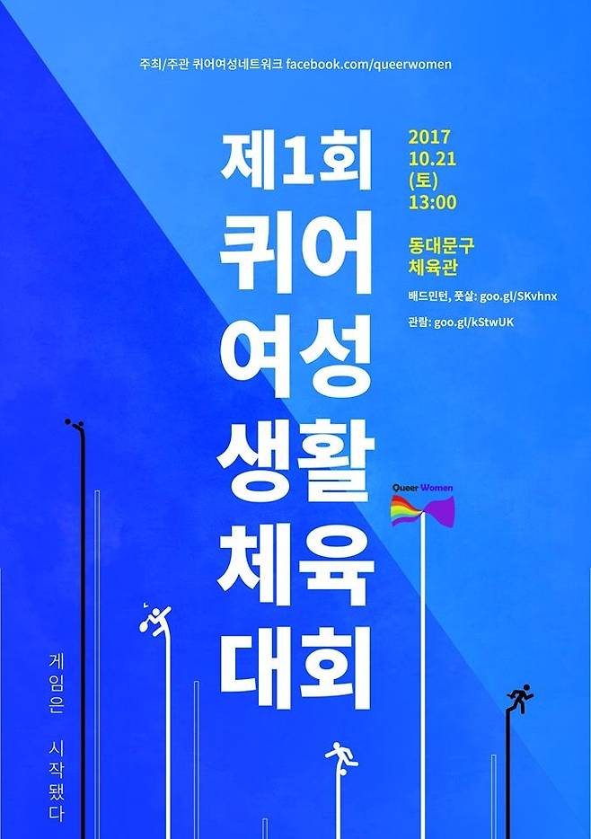 | ▲ 지난 2017년 10월 21일 서울 동대문구체육관에서 열릴 예정이던 '제1회 퀴어여성 생활체육대회' 포스터. 동대문구 시설관리공단의 대관 취소로 결국 이듬해로 연기됐다. |