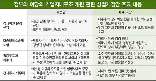 여권은 정부 상법 개정안의 4개 핵심 쟁점 가운데 다중대표소송제와 전자투표제 의무화부터 우선 추진하겠다는 전략을 세웠다. 하지만 한국당이 반대하고 있어 처리하기가 쉽지 않아 보인다. 한국당의 상법 개정안에 대해선 여당이 “기업 편들기용 법안”이라고 반대하고 있다. 다만 정부와 여당은 비상장 벤처기업에 차등의결권을 주는 방안은 추진하고 있다.