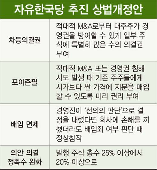 윤 의원이 대표 발의한 상법 개정안에는 차등의결권·포이즌필 등 경영권 방어 방안들이 들어 있다. 정갑윤·권성동 한국당 의원도 비슷한 법안을 발의해 놓은 상태다. 차등의결권은 일부 주식에 특별히 많은 수의 의결권을 부여하는 것이다. 경영권을 보유한 대주주의 주식에 대해 보통주보다 더 많은 의결권을 부여해 적대적 M&A로부터 경영권을 방어하는 수단으로 이용된다. 포이즌필은 적대적 M&A 또는 경영권 침해 시도가 발생하면 기존 주주들에게 시가보다 훨씬 싼값에 지분을 매입할 수 있도록 미리 권리를 부여하는 것이다.