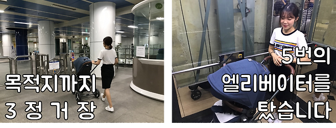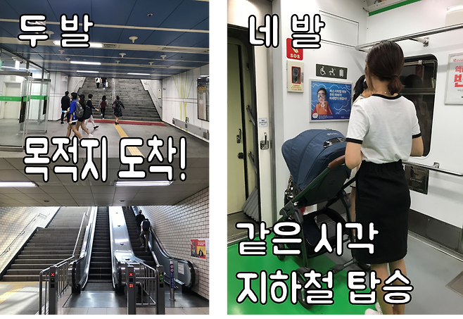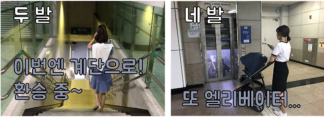 두 발 vs 네 발 지하철 이용 비교체험을 하면서 저상버스도 이용해봤는데요. 유모차 부피가 있다 보니 통로 쪽에 서 있을 수밖에 없었는데, 사람들이 탈 때마다 눈치가 보이고 미안해서 빨리 내리고 싶은 마음뿐이었습니다. 휠체어를 타야만 하는 장애인의 경우 저상버스 타는 것이 꺼려질 것 같다는 생각을 했습니다.