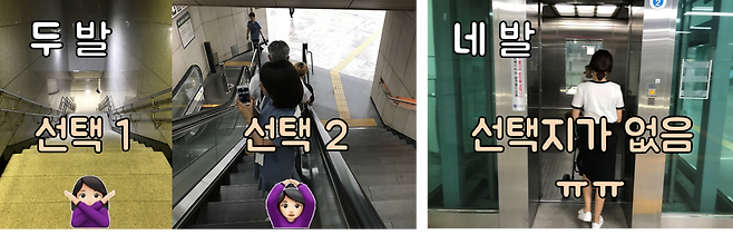 승강장으로 내려가는 길, 두 발 선수는 2가지의 선택지가 있었습니다. 저절로 에스컬레이터 쪽으로 가게 만드는 계단의 스케일에 에스컬레이터를 타고 승강장으로 향하지만, 네 발 선수에게는 선택지가 없죠. 엘리베이터를 타고 승강장으로 향합니다.