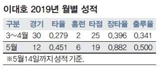 그러나 5월부터 '역시'를 보여 줬다. 출전한 12경기에서 타율 0.451·6홈런·19타점·OPS(출루율+장타율) 1.382를 기록했다. 이 기간 멀티 히트만 9번, 2타점 이상 기록한 경기도 7번이다. 5월 둘째 주에는 리그 타자 가운데 타율(0.593) 홈런(4개) OPS(1.756) 1위에 올랐다.