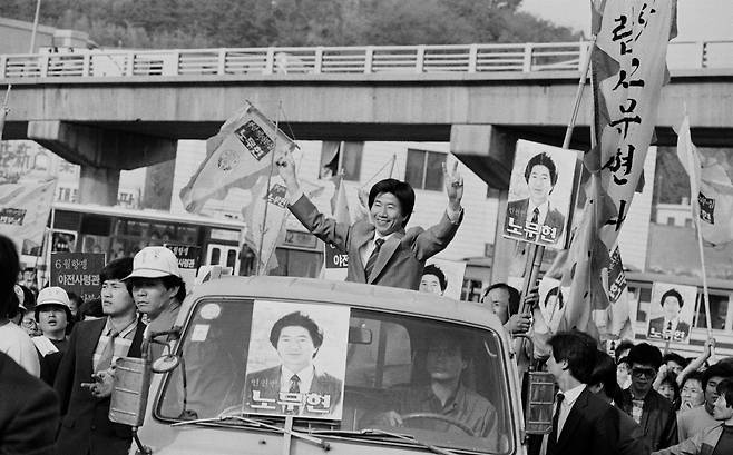 | ▲ 성남국민학교에서 열린 13대 국회의원 부산 동구 선거합동연설회를 마친 노무현 통일민주당 후보가 자동차에 올라 지역구를 돌며 지지를 호소하고 있다. 당시 노무현 통일민주당 후보는 허삼수 민주정의당 후보와의 대결에서 승리해 국회의원으로 당선됐다. |