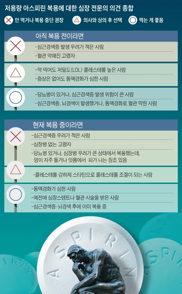 저용량 아스피린이 피를 묽게 해 심근경색을 줄이는 쪽인지, 아니면 출혈 위험이 커지는 쪽인지에 따라 선택이 달라진다. 고령자는 혈관이 약해져 있기 때문에 출혈 위험이 높아 일반적으로 복용을 권장하지 않는다. 대한심뇌혈관질환예방학회 박창규(고려대의대 심장내과) 이사는 "아스피린을 먹고 있는데 멍이 자주 들거나, 양치질할 때 잇몸에서 피가 나는 등 출혈 징조가 있으면 복용하지 않는 게 좋다"고 말했다. "심장병 발병 위험 인자가 많은 상태에서 몇 년째 복용했고, 출혈 징조 없이 잘 먹어 왔다면 굳이 아스피린은 중단할 필요는 없다"고 박 교수는 덧붙였다.