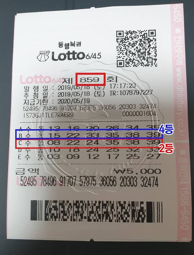 한편 로또 859회 수동 2등 당첨자가 로또복권 커뮤니티 로또리치에 실제 당첨복권 사진을 공개해 눈길을 끌었다.