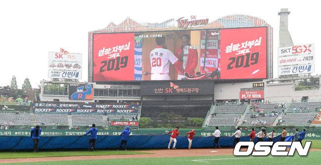 경기 시작 앞서 방수포 깔리는 인천 SK행복드림구장 [사진]