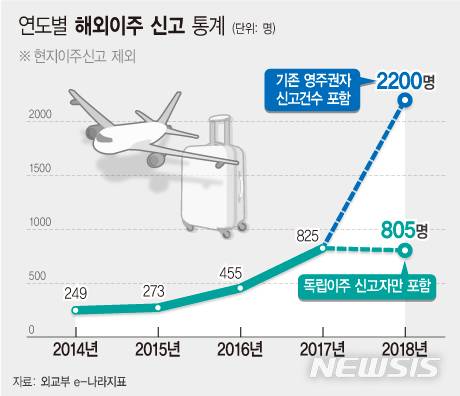 보도에 따르면 2018년 외교부에 해외 이주를 신고한 인원은 2200명으로 2017년 825명에 비해 1375명 증가했다. 기존에 해외에서 살다 현지 영사관에 신고한 ‘현지이주자’는 제외한 수치다.