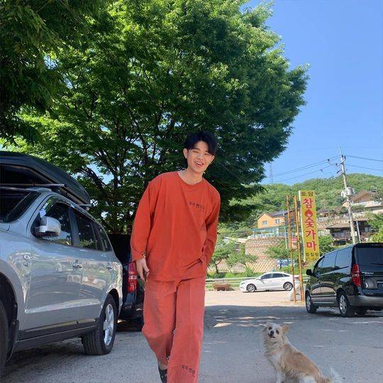 사진 속 그리는 숯가마 옷을 입고 주머니에 한 손을 꽂은 채 걸어 오고 있다.