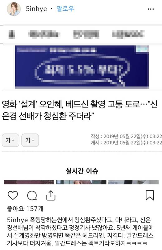 해당 기사는 "영화 '설계' 오인혜, 베드신 촬영 고통 토로…'신은경 선배가 청심환 주더라'"는 제목이다. 영화 '설계'가 화제가 되자 과거 에피소드를 기사화 한 것이다.