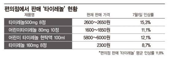대표적인 편의점 상비약 '타이레놀' 4종의 가격이 11.8%가 인상된다.