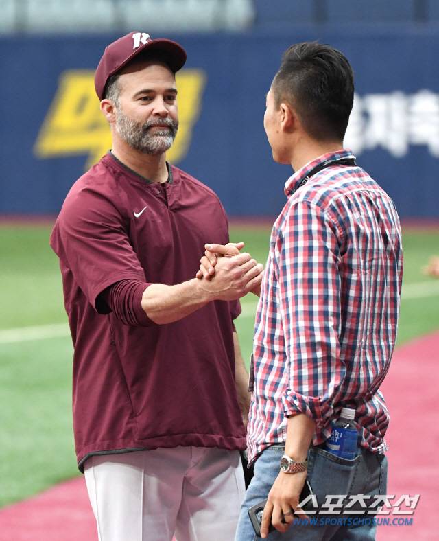 22일 서울 고척스카이돔에서 KBO리그 키움 히어로즈와 NC 다이노스의 경기가 열린다. 경기 전 키움 선수들이 훈련에 임하고 있다. 키움 김치현 단장이 나이트 코치와 대화를 나누고 있다. 고척=송정헌 기자 songs@sportschosun.com/2019.05.22/