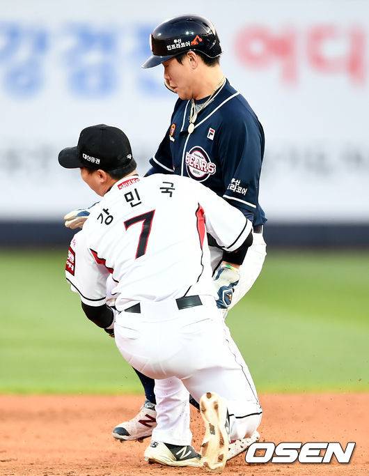 2회초 1사 1루 두산 국해성의 헛스윙 삼진때 1루 주자 박세혁이 2루 도루중 kt 강민국에게 태그아웃 당하고 있다. /pjmpp@osen.co.kr
