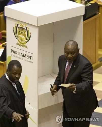 epa07592009 South African President Cyril Ramaphosa (R) casts his vote for the Speaker of Parliament during the swearing in of new members of the National Assembly and election of the National Assembly speaker in Parliament, Cape Town, South Africa 22 May 2019. This is the first sitting of parliament following the 2019 general elections making this the 6th parliament since the fall of apartheid. EPA/NIC BOTHMA