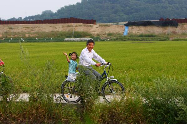 노무현 자전거 뒷자리 손녀, 어느덧 부시와 나란히..로고도 바뀌어