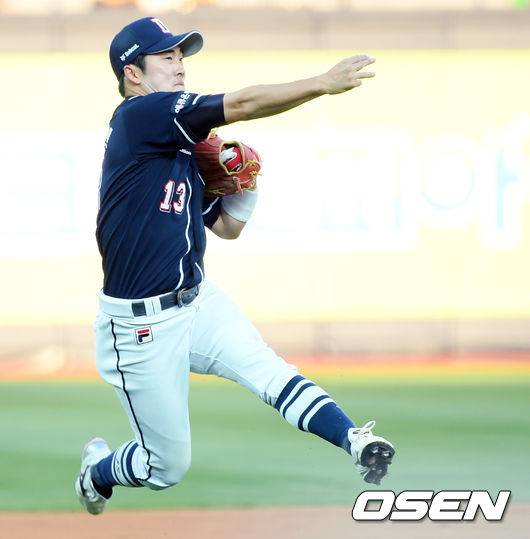 1회말 2사 KT 강백호의 내야땅볼 타구를 잡은 두산 3루수 허경민이 러닝스루우로 깔끔히 아웃카운트 잡아내고 있다. / eastsea@osen.co.kr