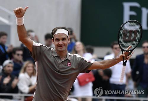 epa07602929 Roger Federer of Switzerland reacts after winning against Lorenzo Sonego of Italy during their men?s first round match during the French Open tennis tournament at Roland Garros in Paris, France, 26 May 2019. EPA/JULIEN DE ROSA