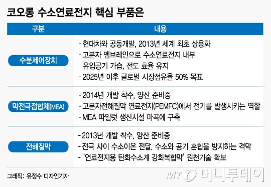 코오롱인더스트리는 △수분제어장치 △막전극접합체(Membrane Electrode Assembly·MEA) △연료전지용 전해질막 등 수소 모빌리티 부품분야에서 통합 솔루션을 제공하는 유일한 국내 업체로 평가받는다.