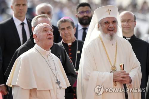 Pope Francis stares at the facade as he arrives for a prayer with Romanian Orthodox Patriarch Daniel, at the National Cathedral, in Bucharest, Romania, Friday, May 31, 2019. (AP Photo/Andreaa Alexandru)