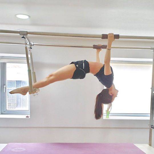 사진 속 조현영은 운동복을 입고 필라테스 캐포머 위에서 운동을 하고 있다.
