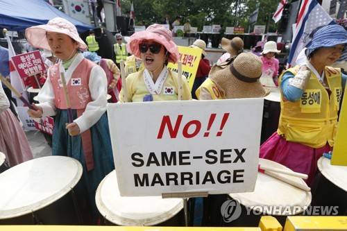 epa07617062 People shout slogans as they protest against same sex marriage during the Korea Queer Culture Festival in Seoul, South Korea, 01 June 2019. The 20th Korea Queer Culture Festival runs from 21 May to 09 June 2019. This years theme is 'The 20th Leap for Equality'. EPA/JEON HEON-KYUN