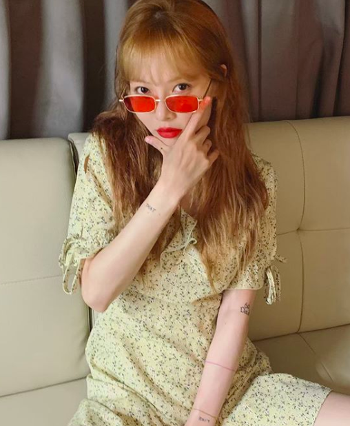 현아는 2일 오후 자신의 인스타그램에 노란색 프릴 원피스에, 빨간색 선글라스를 착용하고 있는 모습이 담긴 여러 장의 사진을 게재했다.
