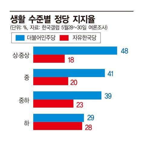 반면 생활수준이 '하'라고 답변한 이들의 정당 지지율은 민주당이 29%, 한국당 28%로 비슷한 수치를 보였다.